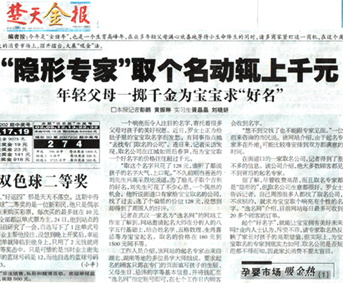 《楚天金报》近日以较大篇幅报道了当今起名业界的最新动态,文中专门对《逸名网》进行了介绍。现在人们对名字的理解有了更新的认识。名字不只是一个简单的代号,而是一种文化,同时也是体现个性的一种方式 。正如报中所说,现在的年轻父母们为了使自己的孩子有个美好的未来不惜动辄千元为宝宝求“好名”,而逸名网就是为人们提供这种专业服务的一个平台,网站特邀了许多知名专家,将有着三千多年历史的《易经》理论、传统的中华姓名学和现代汉语中字义、音韵、字型词汇等方面的知识完美地结合,为用户提供起名测名等一条龙的专业服务。同时,文章中也提醒消费者注意分辨起名公司的实力和信誉,倡导理性消费。 |