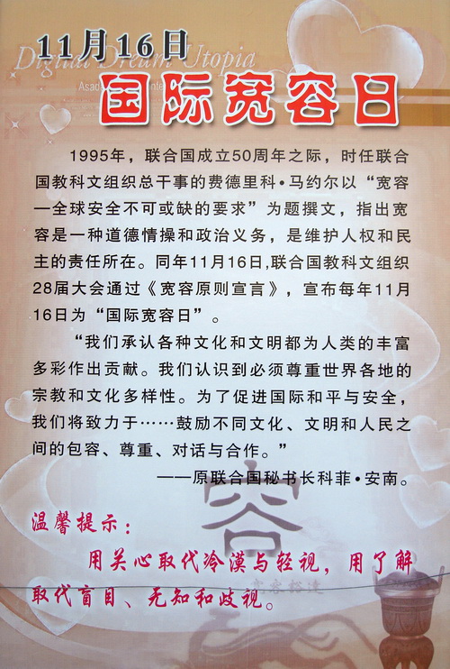 1995年11月,联合国教科文组织第28届大会通过《宽容原则宣言》,宣布每年11月16日为"国际宽容日"。1996年,联合国大会通过决议,呼吁各国政府在国际宽容日举办一系列活动,通过教育、宣传等途径倡导宽容理念。
