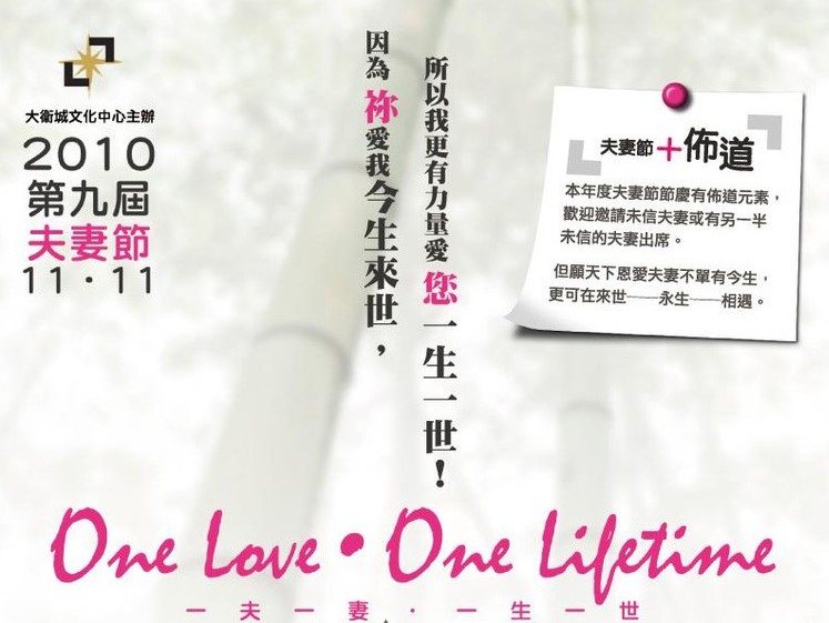 每年的11月11日在香港被称为夫妻节,取其一夫一妻,一生一世的意思。由大卫城文化中心总监吴振智牧师于2000年1月倡议创立夫妻节,得到香港传媒广泛报导。并于2002年11月11日举行第一届“夫妻节11.11”,定11月11日乃取意四个1,“一夫一妻,一生一世”,至2010年已举行九届。美国纽约市及加拿大温哥华市亦有教会及机构响应,于2008年加盟举行夫妻节。至2010年,再有加拿大维多利亚市教会宣布举行第一届维多利亚夫妻节。2010年第九届香港夫妻节将于11月11日假香港文化中心露天广场C区举行,主题为“爱您一世”,纽约、温哥华及维多利亚三市亦将采用相同主题,以示合一。